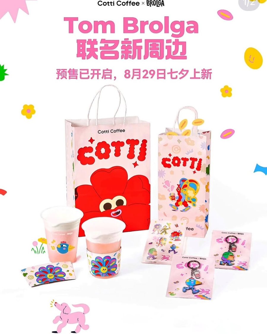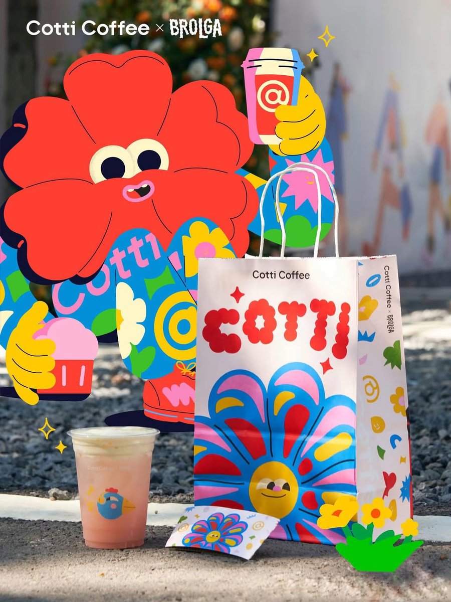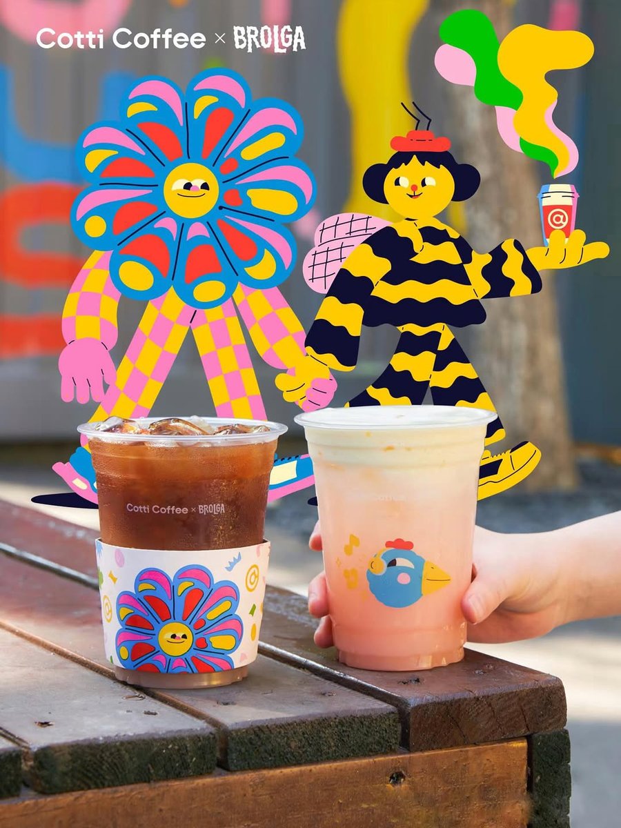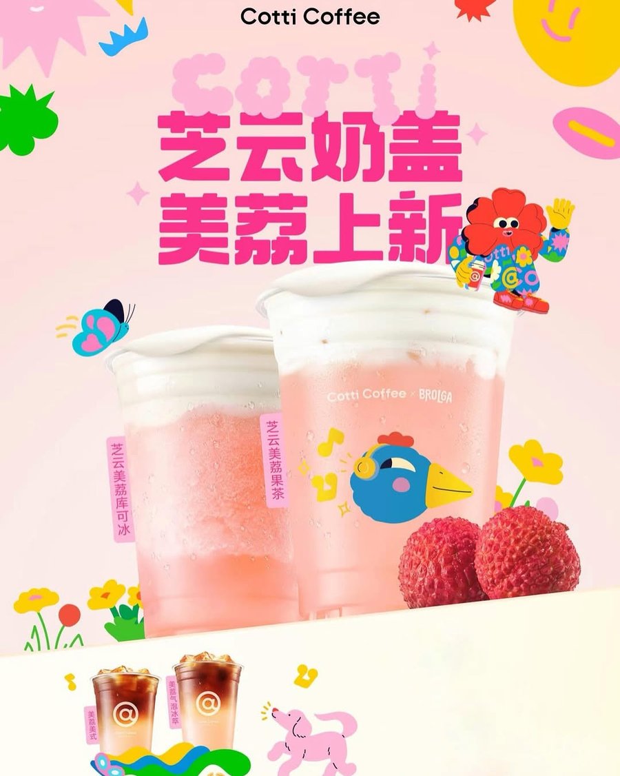 Illustration and merchandising featuring Brolga's work in collaboration with Cotti Coffee, which released a custom lychee drink available in more than 2000 shops in China.