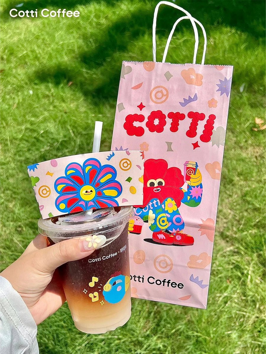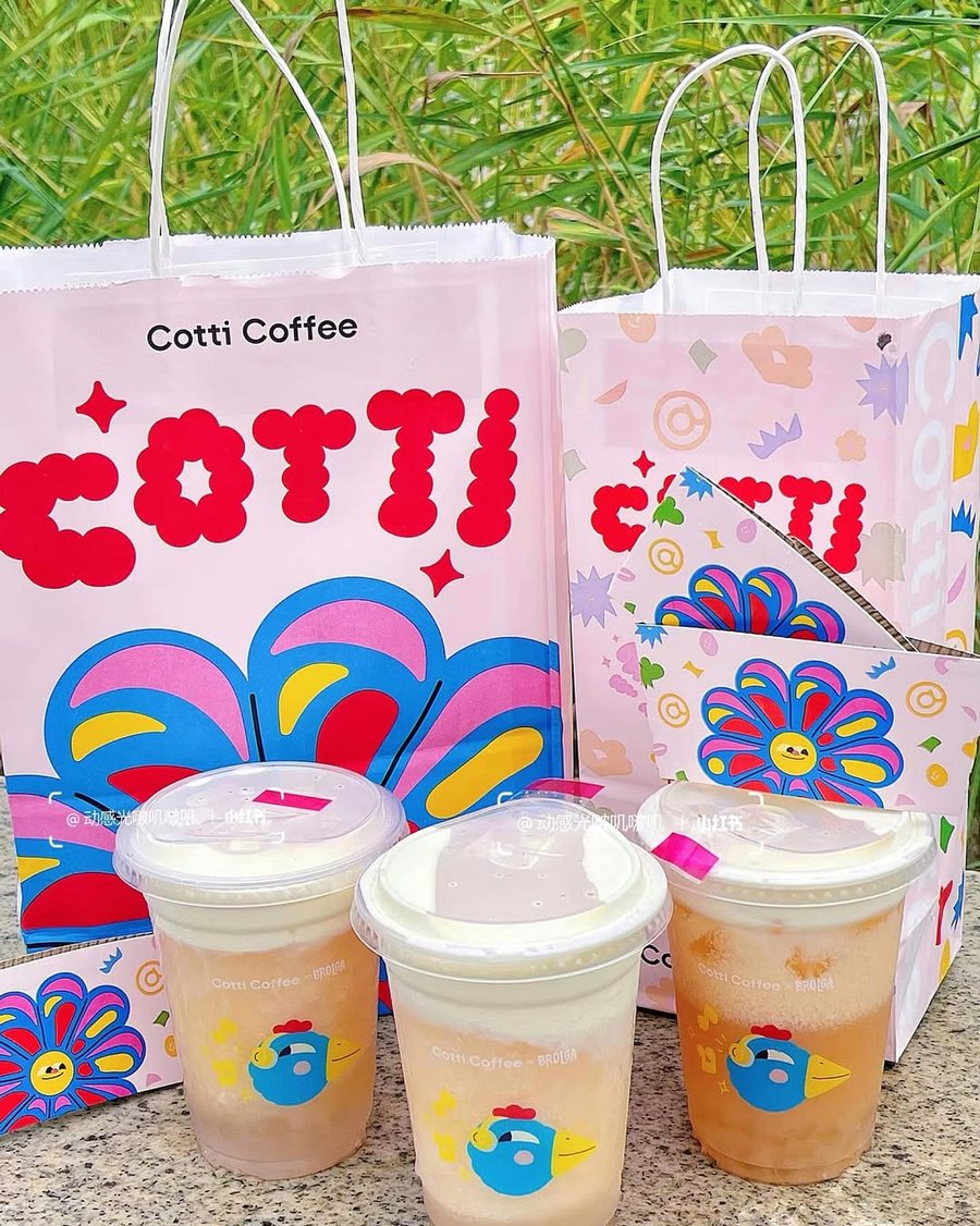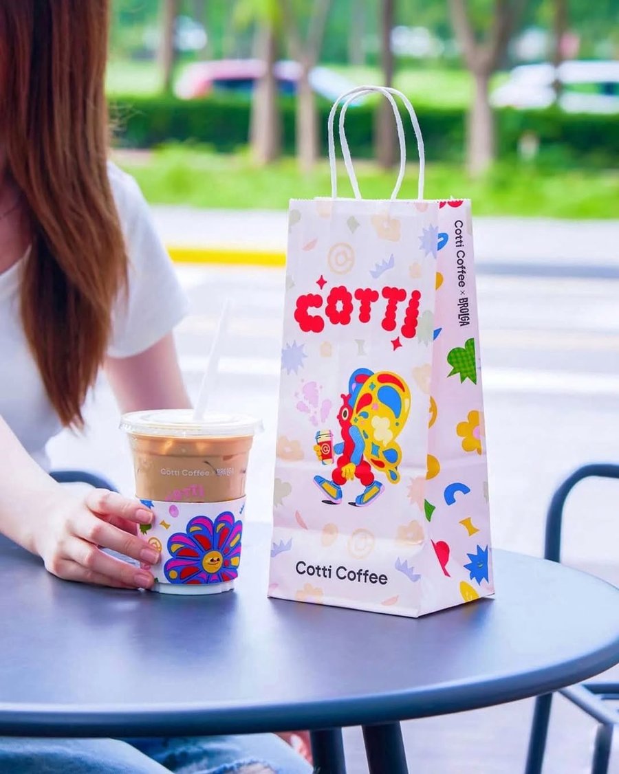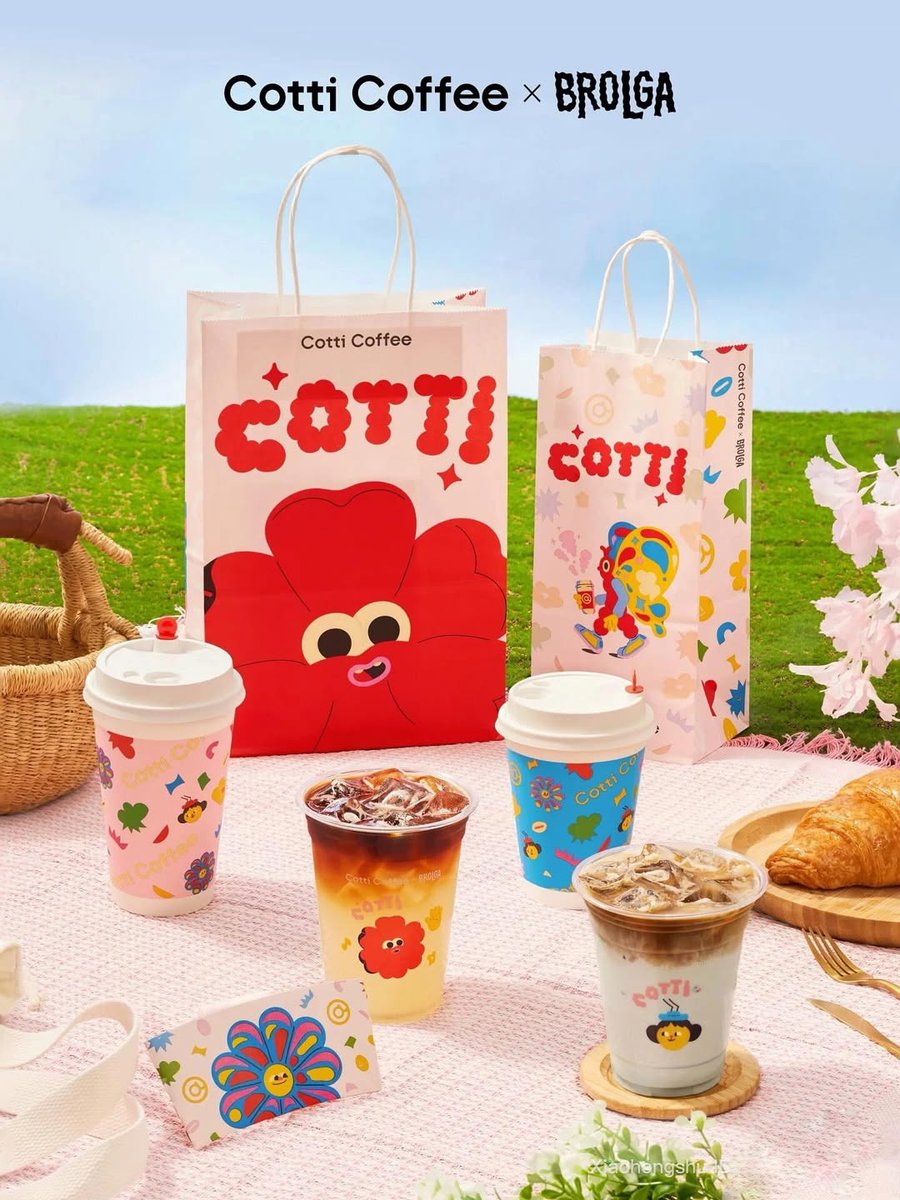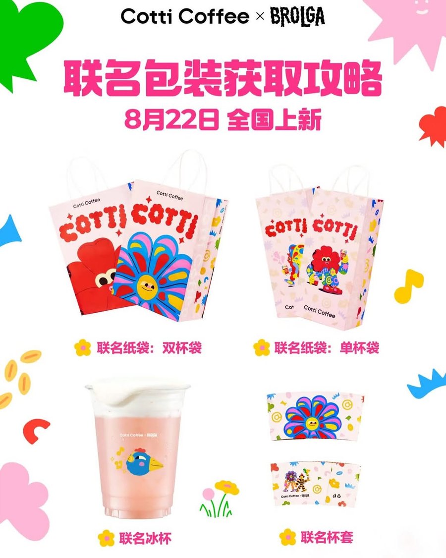 Illustration and merchandising featuring Brolga's work in collaboration with Cotti Coffee, which released a custom lychee drink available in more than 2000 shops in China.