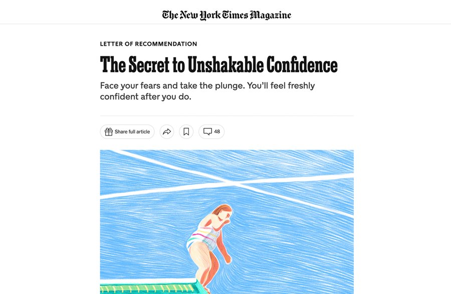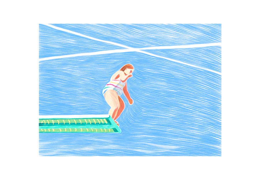 Illustration that appeared in the New York Times issue of August 15th and on its site on the "Letter of recommendation" page. The text is about author Haley Howle's childhood spending time in public pools in Texas. She writes about the confidence and childlike wonder of jumping on a diving board.