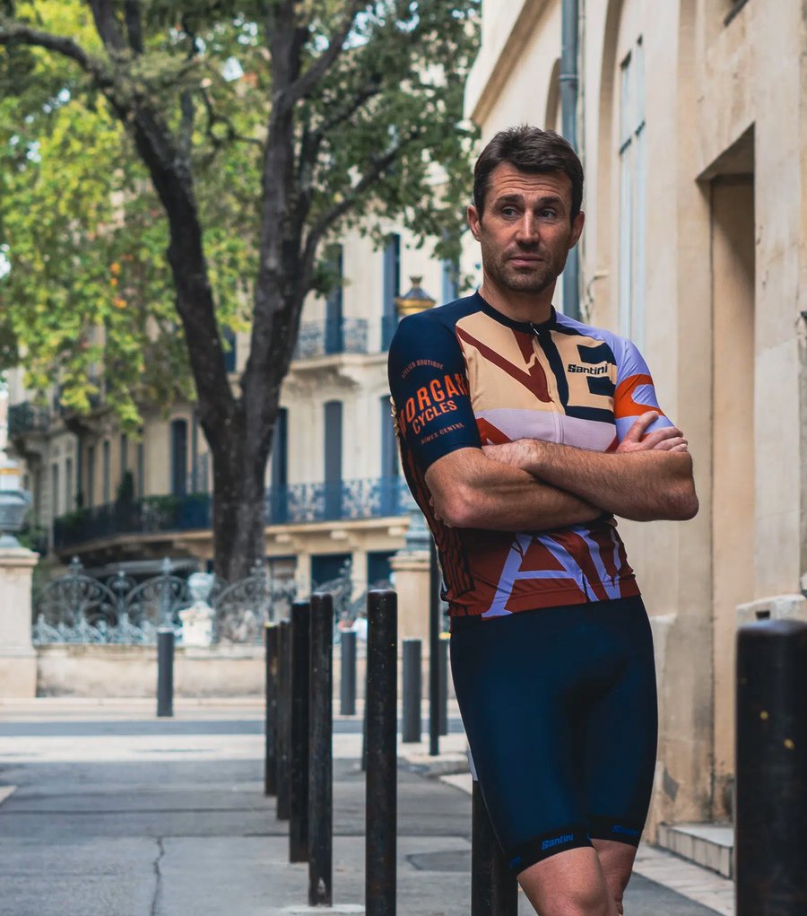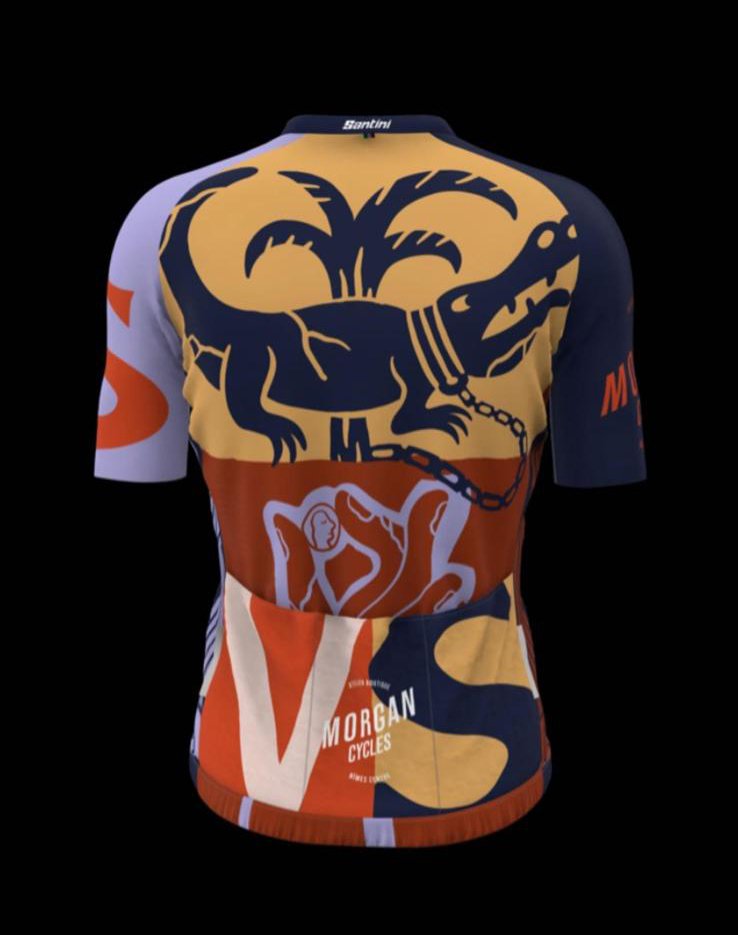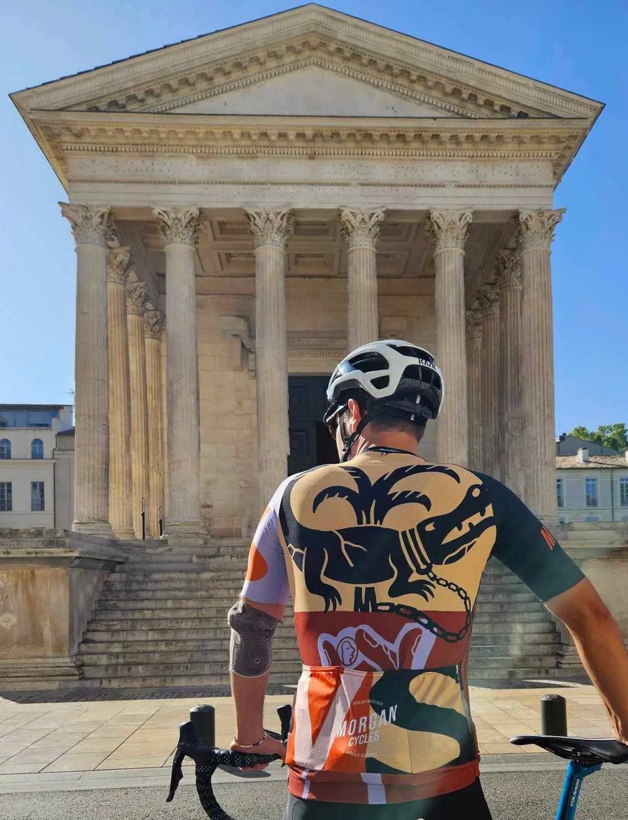 Illustration et design du maillot 2023 de la boutique Nîmoise Morgan Cycles. Nemausus est un maillot hommage à la maison carrée fraîchement nommée au patrimoine mondial de l'UNESCO.
