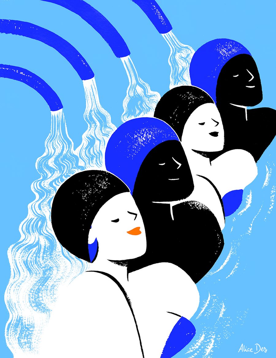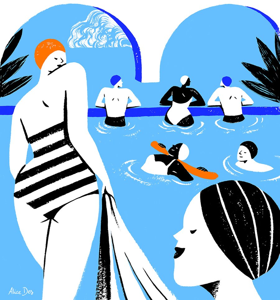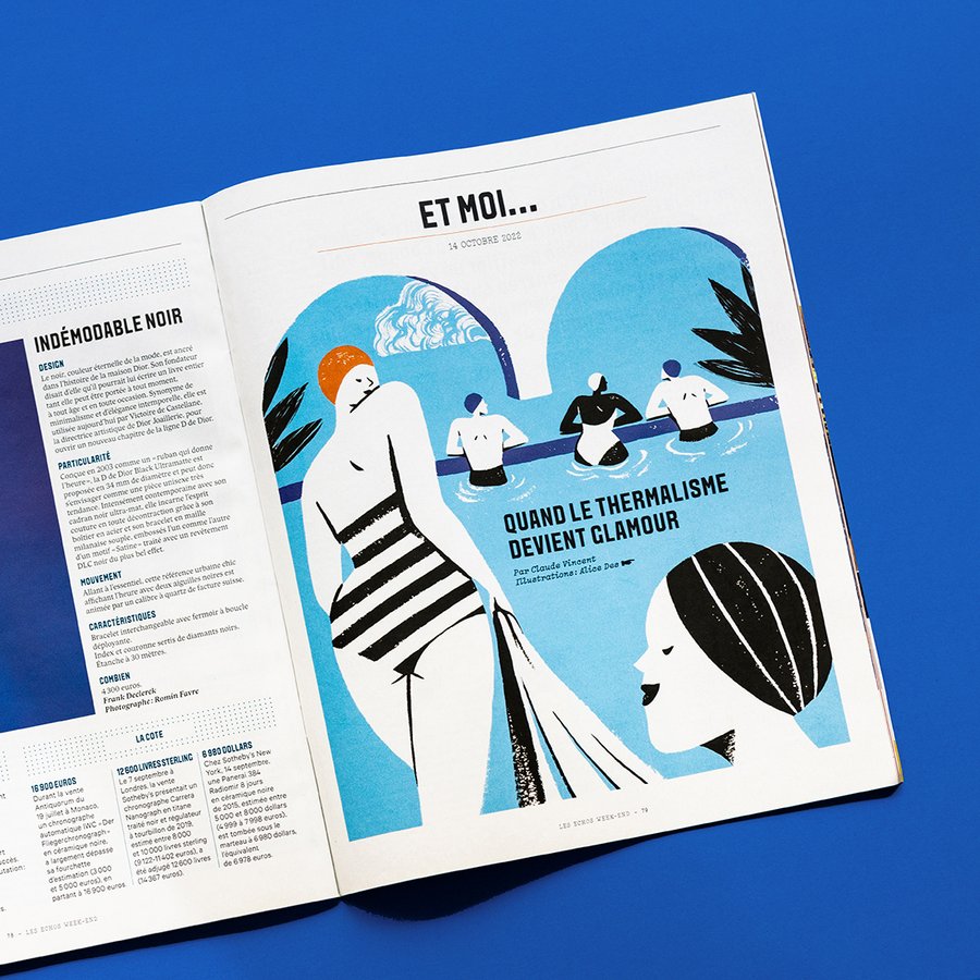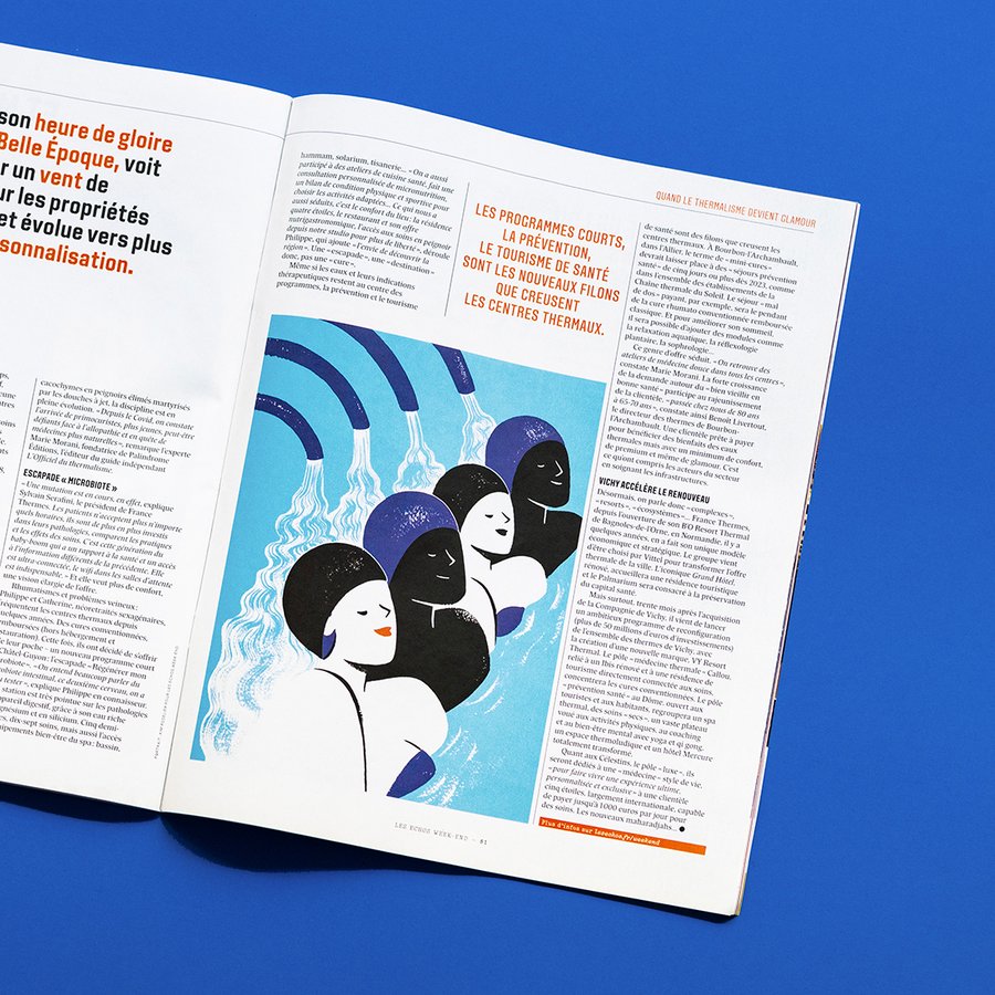 Illustrations éditoriales pour Les Échos Week-End n°322, sur le thermalisme glamour.
