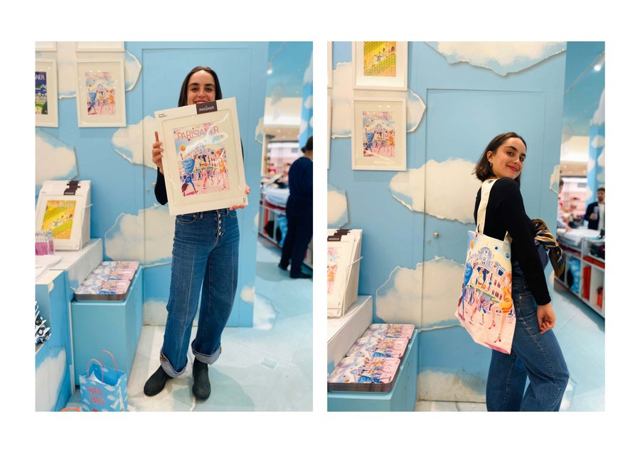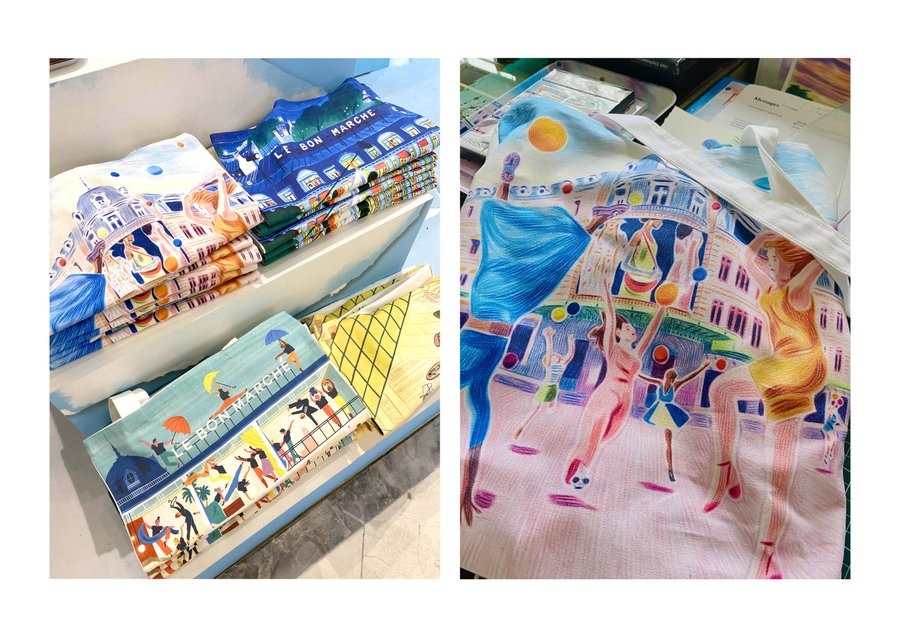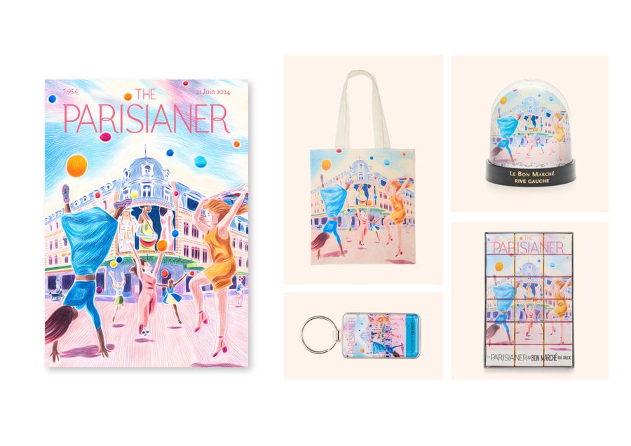 Collaboration between Le Bon Marché and The Parisianer. Creation of a poster on the theme of fashion at Le Bon Marché. The visual was adapted for a range of objects (tote bag, snow globe, water bottle, T-shirt, etc.) Limited edition, September 2024.