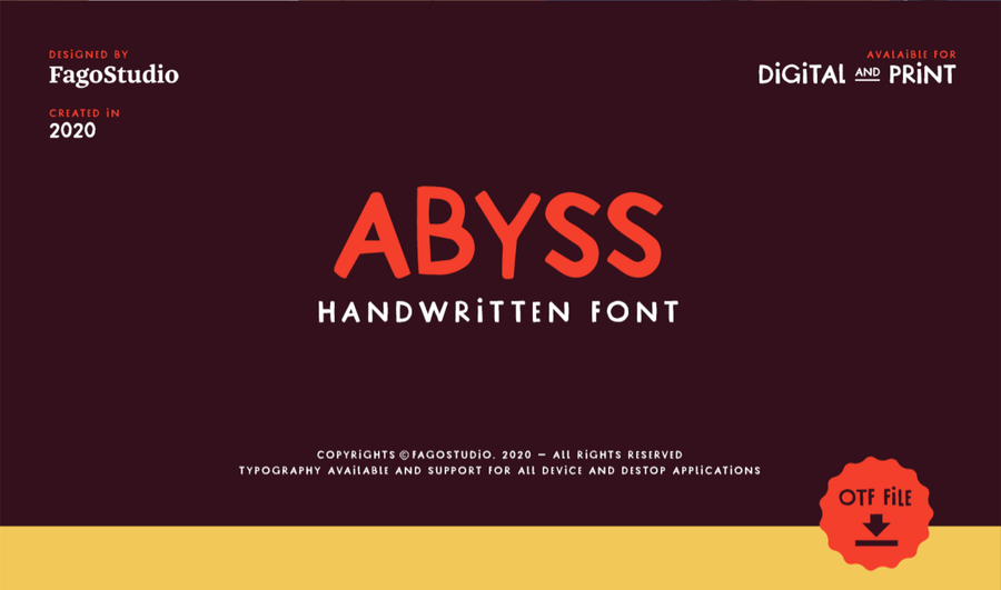 Abyss typeface is a handwritten typeface designed and developed by Fagostudio. A playful typography useful for your compositions. It's for free and available for your prints and applications. Open type features include only caps, numbers, arrow and extra punctuation. Below are some examples of compositions for this typography. It can be used in title but also in paragraph text.