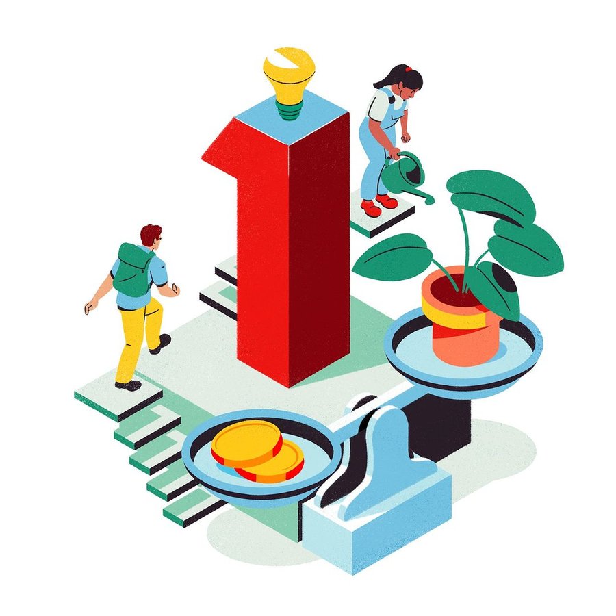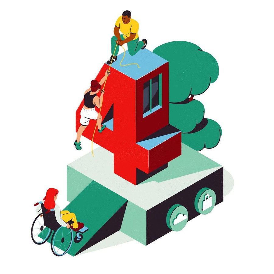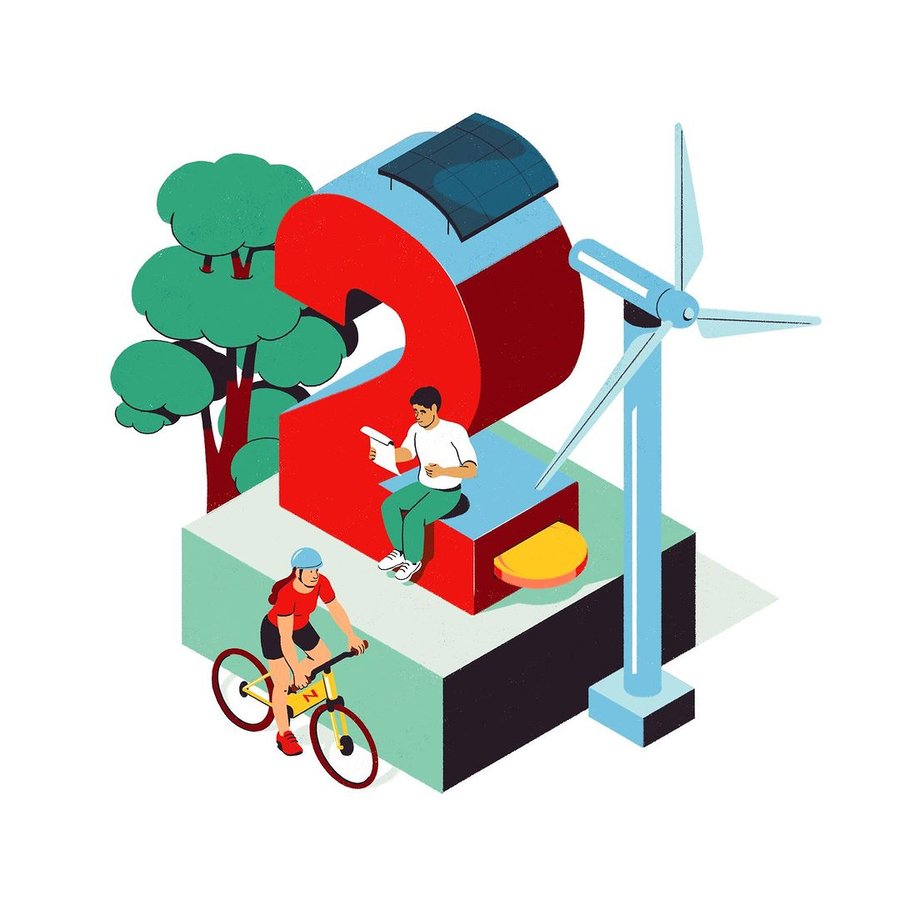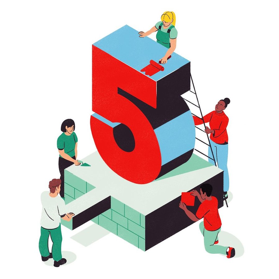 Illustration brought to life with 2D animation and motion design to show the five pillars of commitment of the bank and insurance company Credit Mutuel Arkea