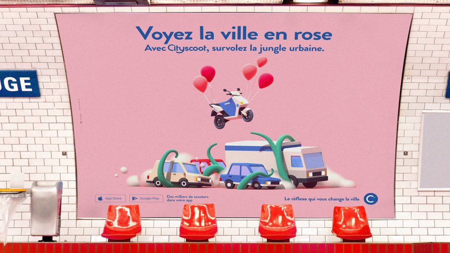 L'agence Socialclub a demandé à Guillaume de créer les visuels de la nouvelle campagne d'affichage Cityscoot ainsi que 4 films d'animation.
