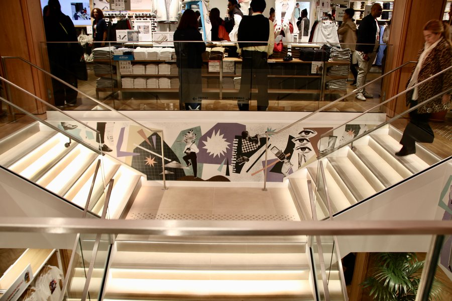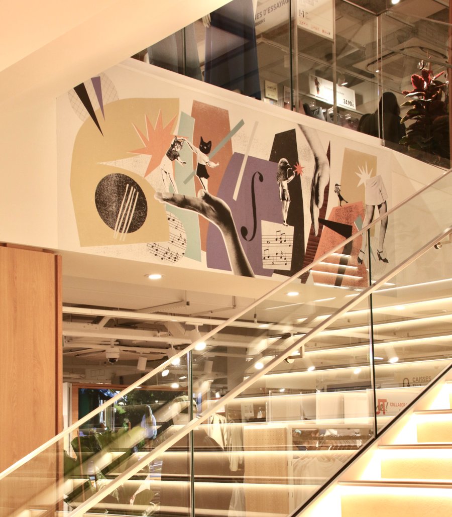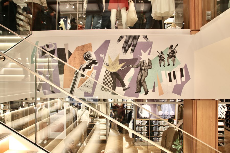 For the opening of its new store on Avenue de Wagram in Paris, Uniqlo France asked Mathilde Aubier to create three murals paying tribute to the building's 1930's jazz club roots.