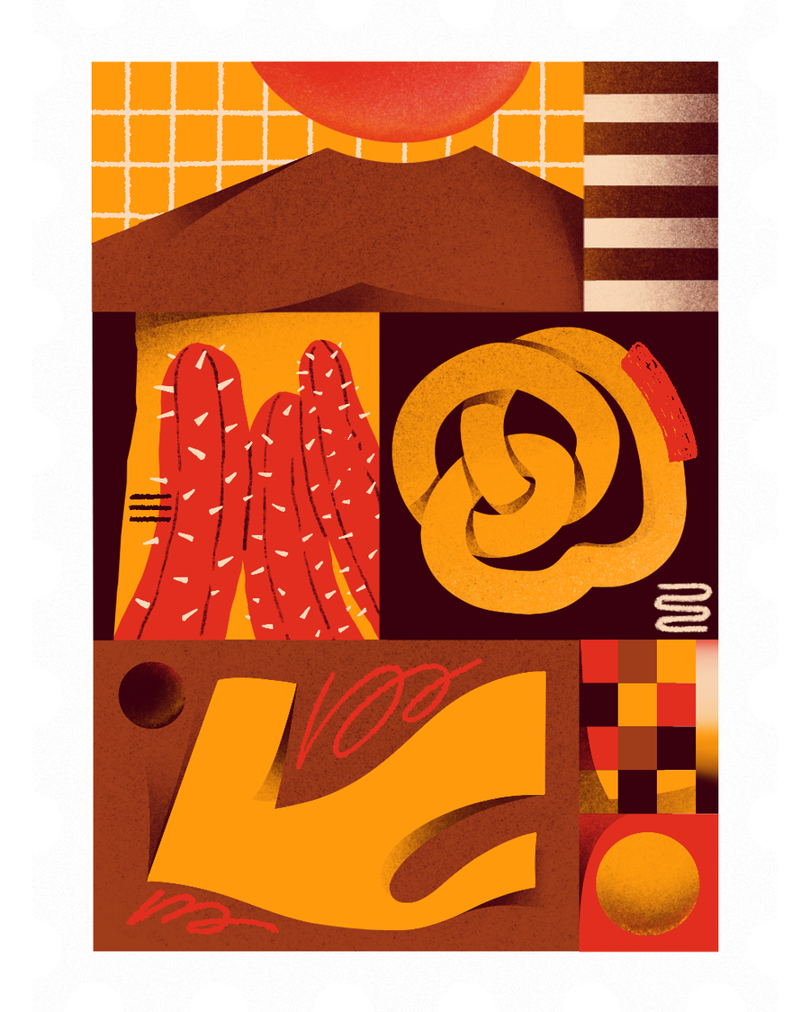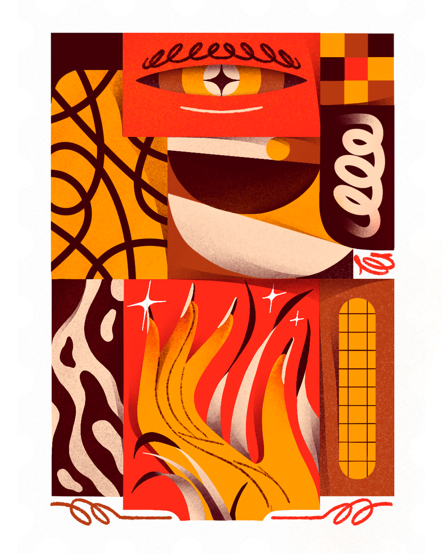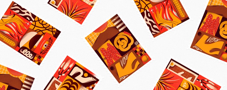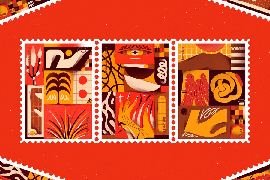 This collection of stamps embodies the abstract and colorful style of the artist alongside with his answers to the interviewer's catchy questions!