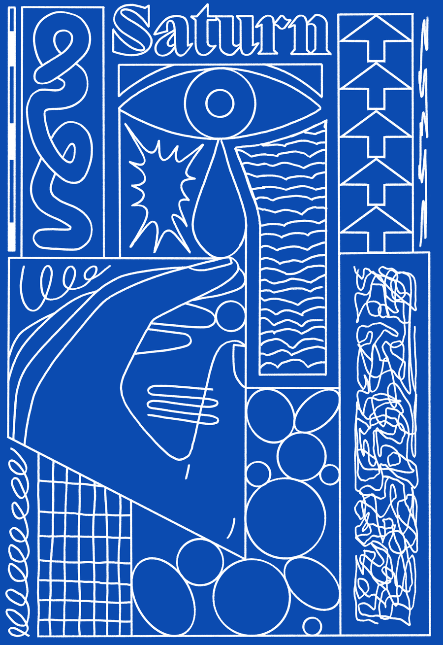 Hermann Koudou, plus connu sous le nom de Saturn, est un illustrateur et graphiste français. Ses compositions sont des assemblages iconographiques combinant formes simples et des couleurs vives, créant ainsi des motifs symboliques évoquant un ésotérisme moderne sous acide. Mêlant abstraction et figuration, son traité se prête aussi bien à l’illustration pure qu’à la sérigraphie ou l’animation voir même à la création de tapis. Il qualifie son Art de primitif, c’est probablement parce que c’est un créatif intuitif qui fait des hiéroglyphes modernes.